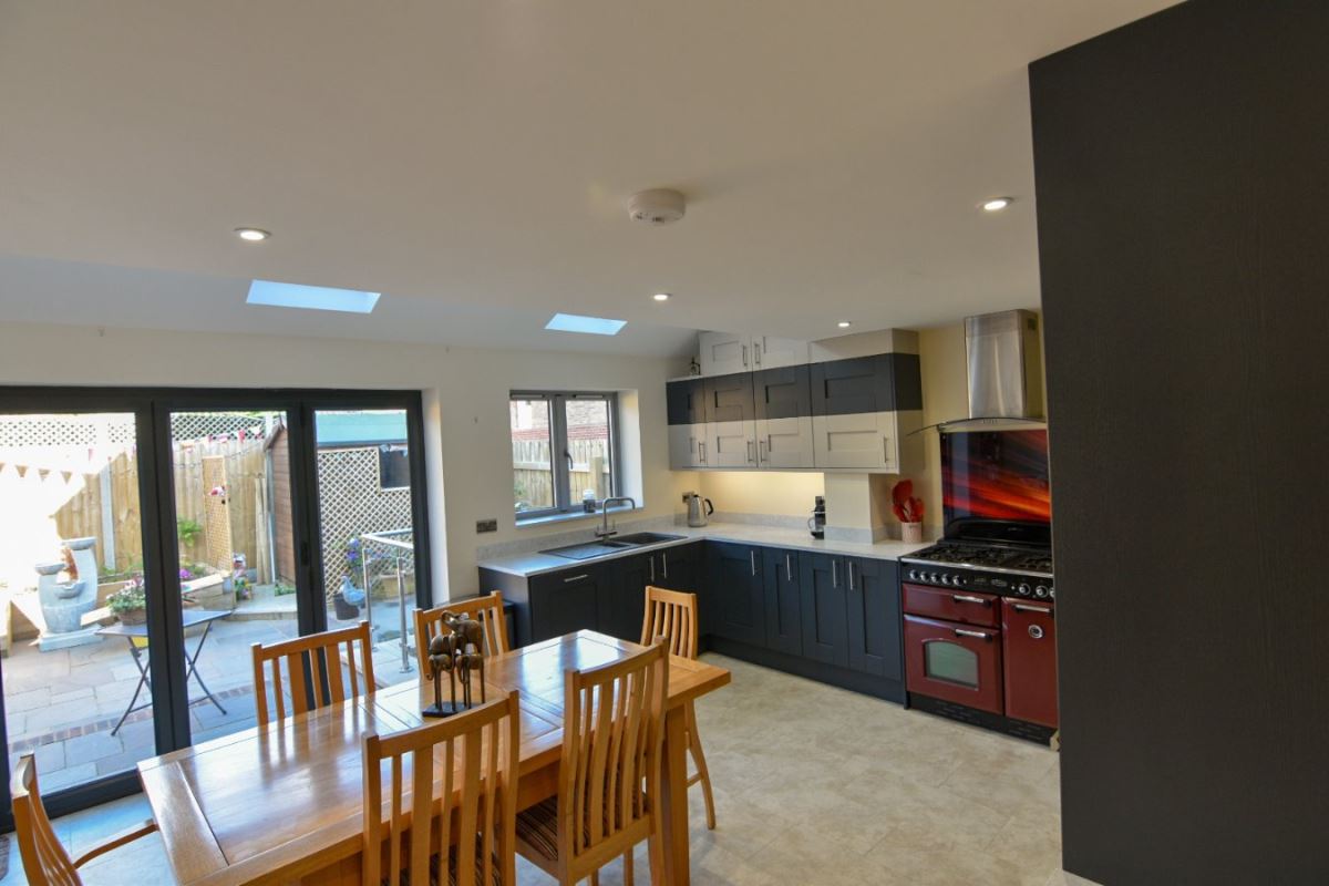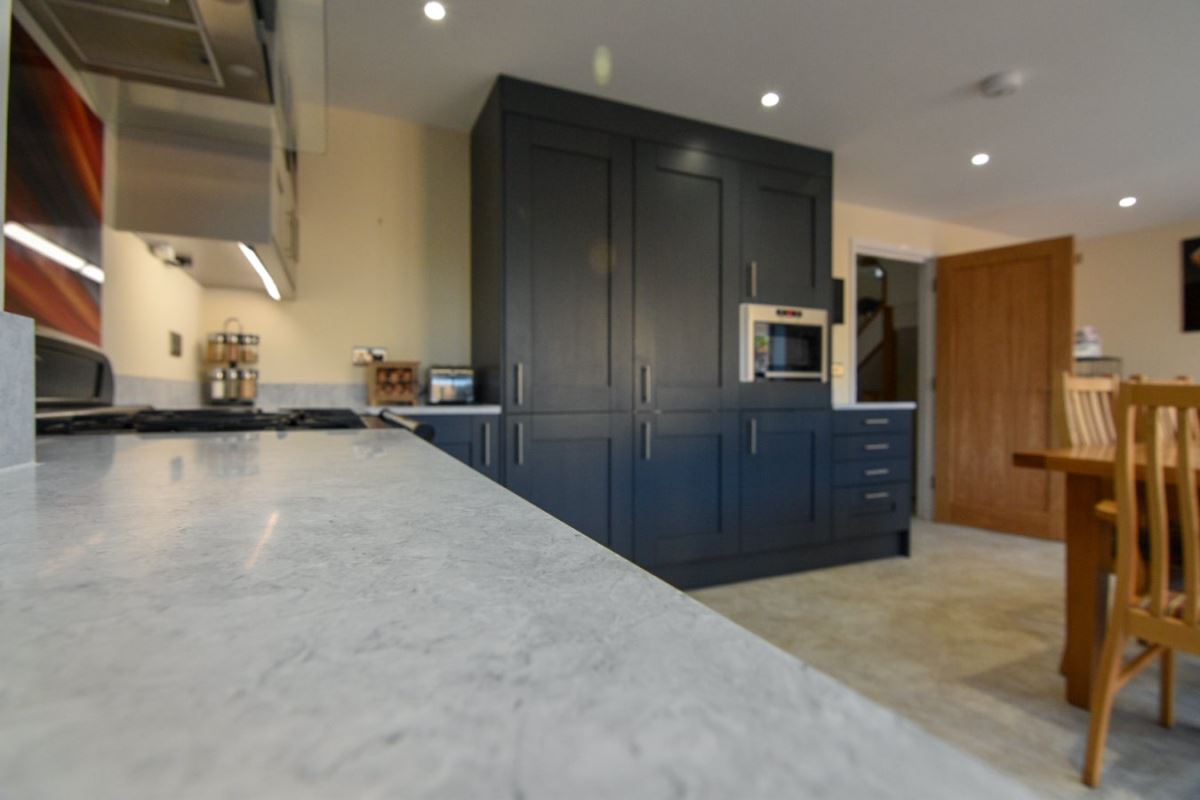 In keeping with the modern theme of this new-build property we've given a traditional kitchen cabinet door a contemporary twist with the use of different worktops and colours. No space has been wasted in this kitchen, with Kessebohmer storage solutions in both corners, and a larder pull-out to give a great option in vertical storage too!