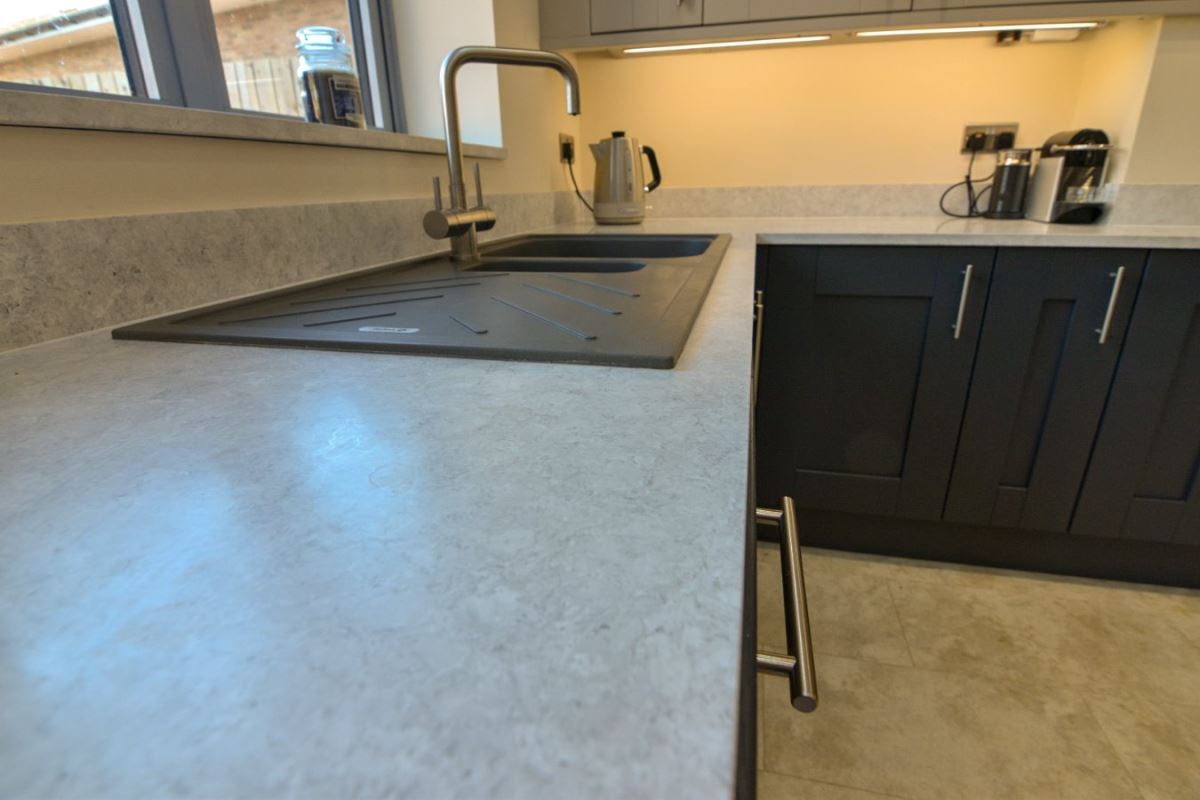 We've used a traditional shaker door here from our Mornington range (in Charcoal and PTO Cashmere) but given it a modern feel. The use of a bold main colour makes a statement and sets these cabinets apart from the rest of the lighter colours in the kitchen. The solid surface worktops (in Pietra Paper Moon) and the second colour on other cabinets and doors stand out much more in contrast.