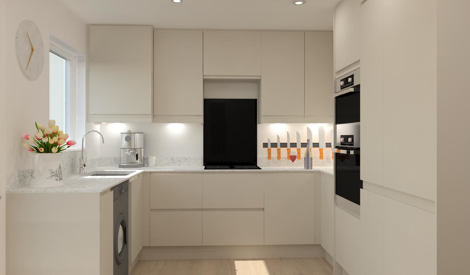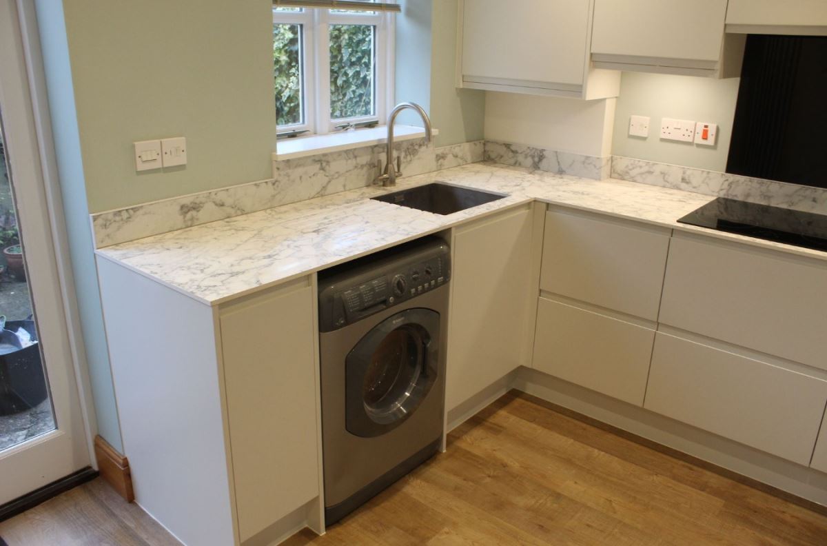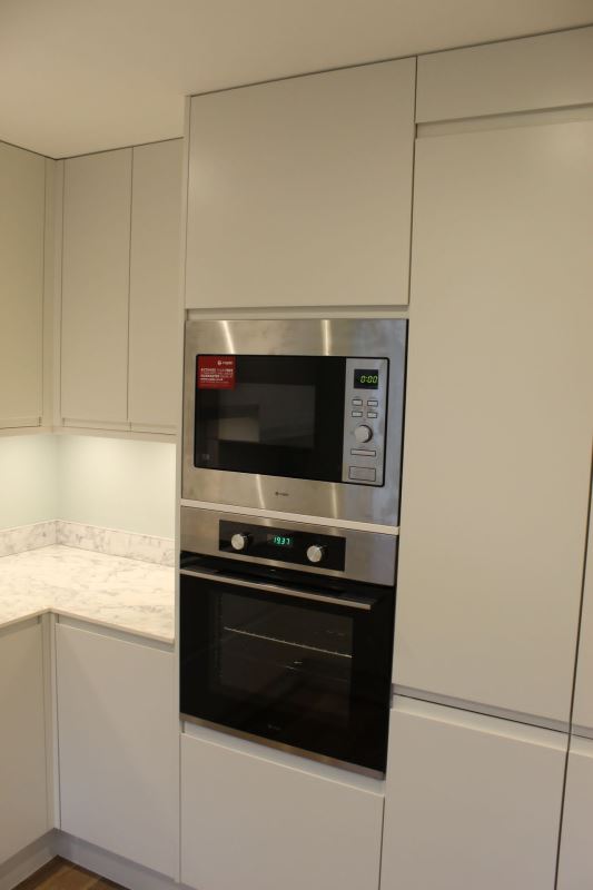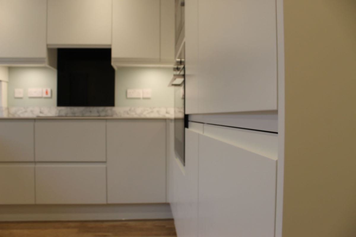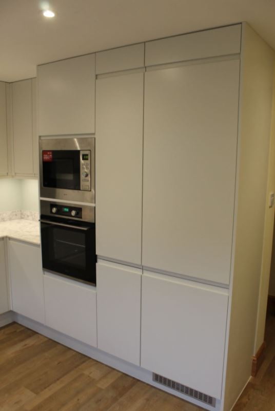 Our client approached Phase- 3 Kitchens with the aim of upgrading their dated Kitchen, to a newer model with a modern feel. With the use of handle-less doors, slim worktops and light colours we have been able to achieve exactly that. In keeping with the modern aesthetics, our client upgraded their appliances and we were able to cleverly fit everything into the space including; a slimline Dishwasher, eyelevel Oven and integrated Fridge Freezer. We even had the space to include a larder unit (one which is actually big enough to be useful!) During installation some bespoke unit alterations were required to allow space for some large piping which could not be moved. All cabinets are made by Phase-3 in our workshop, bespoke alterations such as this are therefore possible and just one of the many reasons the client chose to work with us.