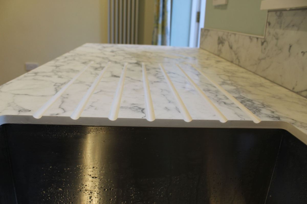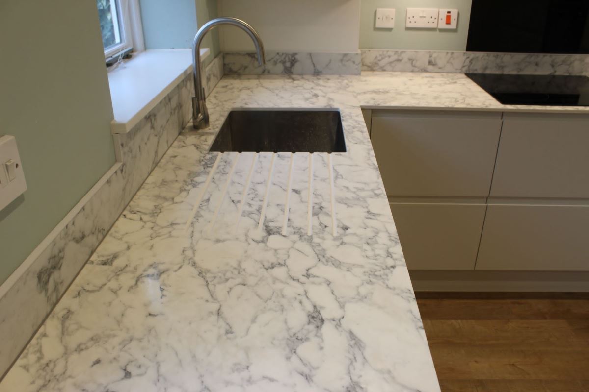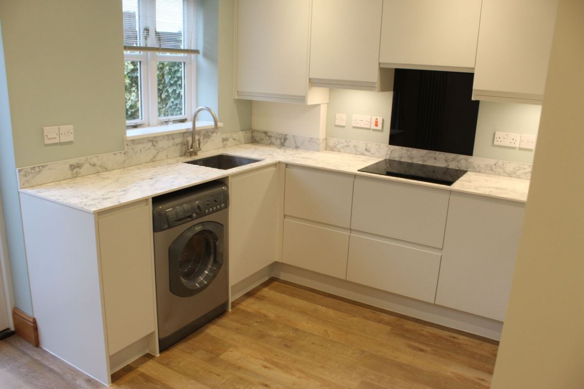 Our client approached Phase- 3 Kitchens with the aim of upgrading their dated Kitchen, to a newer model with a modern feel. With the use of handle-less doors, slim worktops and light colours we have been able to achieve exactly that. In keeping with the modern aesthetics, our client upgraded their appliances and we were able to cleverly fit everything into the space including; a slimline Dishwasher, eyelevel Oven and integrated Fridge Freezer. We even had the space to include a larder unit (one which is actually big enough to be useful!) During installation some bespoke unit alterations were required to allow space for some large piping which could not be moved. All cabinets are made by Phase-3 in our workshop, bespoke alterations such as this are therefore possible and just one of the many reasons the client chose to work with us.