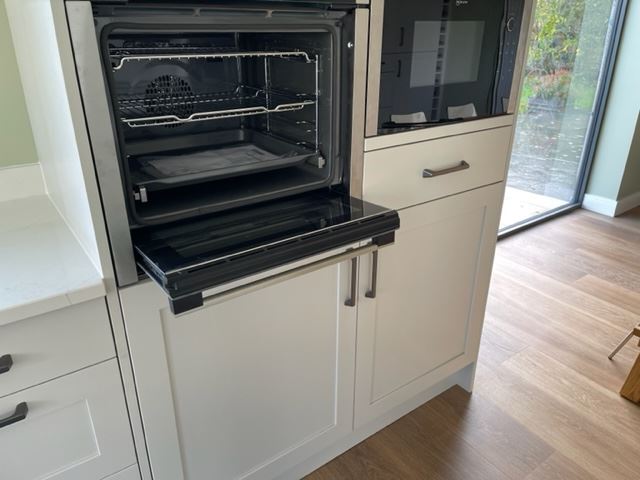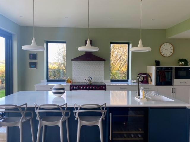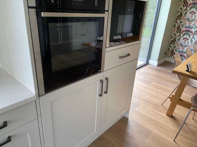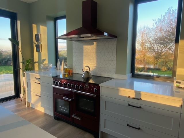 Our client specified they would like this to run perfectly parallel with the Kitchen, the range needed to be positioned exactly central to the 2 windows with the Quartz worktop running beautifully into the window seal providing an infinity effect. 2 bespoke studio height oven units were also provided.
