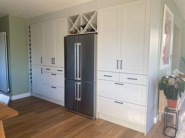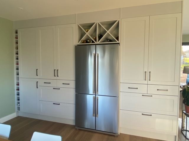 It was agreed that a feature was required in order to break this bank of tall units up. Working closely with our customer we came up the idea of a bespoke cross sectioned wine rack to fit perfectly above the Fridge freezer with 2 larger panty units either side. A tall bespoke wine rack was also provided to fill the remaining space.