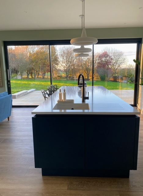 This is a fully bespoke handless island with a full wrap around top rail. We spent many hours ensuring the worktops were perfect- the measurement needed to be exactly 3.1 x 1.3 meters, with a perfectly central sink and every overhang needed to be perfectly millimetre equal on all sides. The delivery and installation of the worktop proved to be the difficult part, requiring a record breaking 6 people to lift.