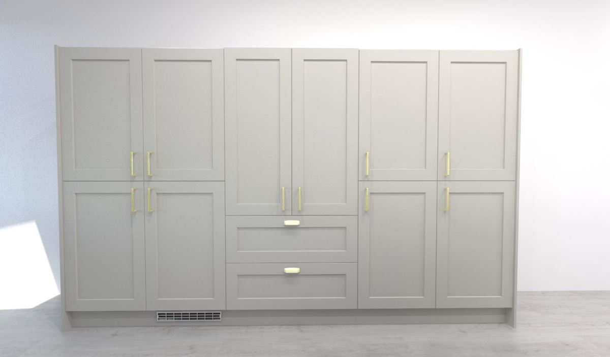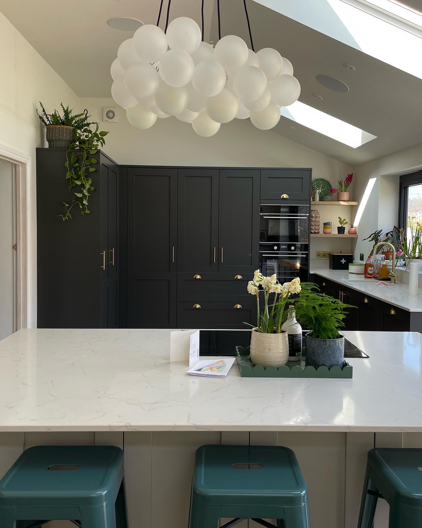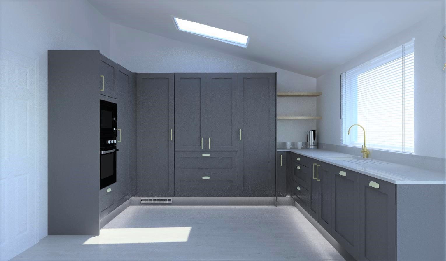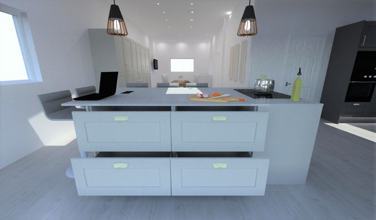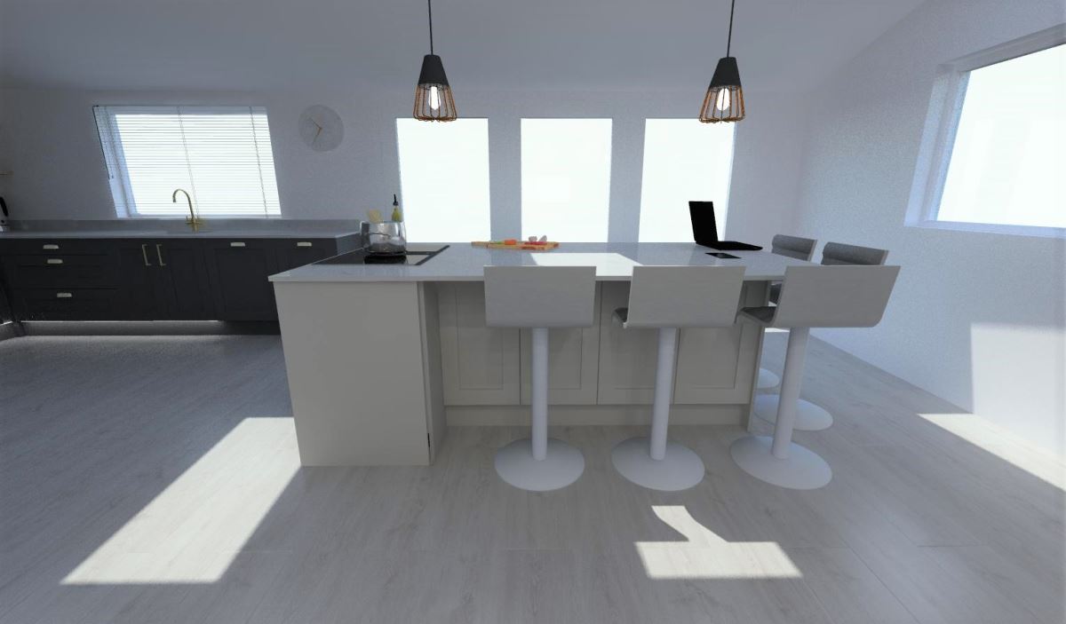 During the design process, the layout changed a number of times. The island was actually amended at the last moment, just before delivery as after spending some time mocking the Kitchen up on site, it was decided it would function better the other way round. This is reflected within the images above.