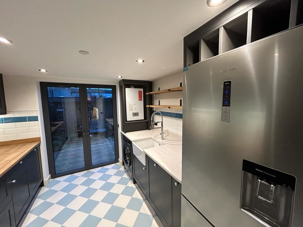 The use of both Quartz and wood worksurfaces highlight the uniqueness of this project and despite looking amazing has also been designed for practical reasoning. Using a wooden worksurface around an open Belfast sink can lead to potential problems and we therefore do not recommend. Instead, our client opted for Quartz worksurface around their sink, with wooden shelving above to tie to the two sides of the Kitchen together; a wonderful decision.